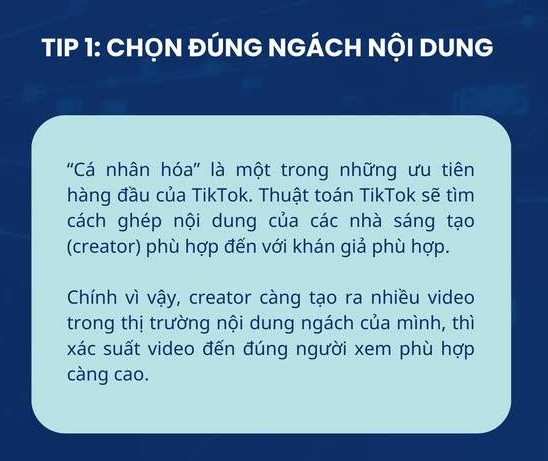 Một trong những yếu tố quan trọng nhất để thành công trên TikTok là chọn đúng “ngách” nội dung (niche). Thuật toán TikTok sẽ phân tích và phân phối video của bạn đến những người dùng có sở thích phù hợp. Vì vậy, hãy xác định rõ bạn muốn hướng đến đối tượng nào (creator phổ biến, người dùng yêu thích các nội dung sáng tạo, hài hước, giáo dục, v.v.).