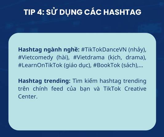 - Hashtag xu hướng: Theo dõi các hashtag đang hot trên trang “For You” hoặc TikTok Creative Center.