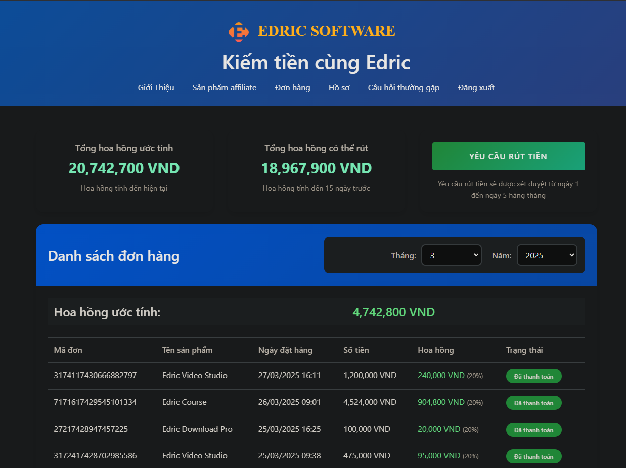 Thanh toán nhanh chóng: Hoa hồng được tổng duyệt từ ngày 1 đến ngày 15 hàng tháng. Ông có thể đặt lệnh rút tiền vào ngày 16 qua trang thanh toán CTV Edric, tiền sẽ được chuyển qua ngân hàng trong 3-5 ngày làm việc.